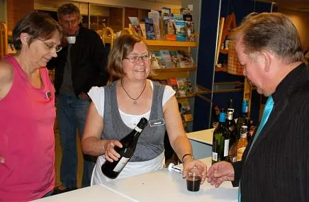 Allan Steen, som akkompagnerede Arne Lundemann, får sig en lille forfriskning i Bibliotekets "Nostalgibar", inden han skal spille med sit band i teltet på Torvet.