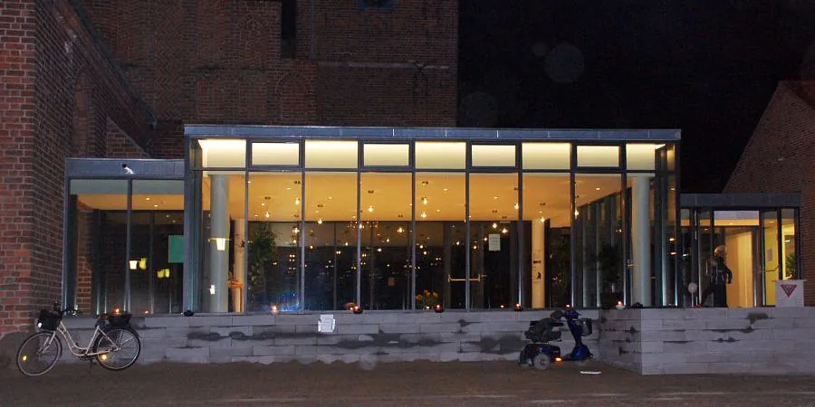 Glashuset i Haslev kirkes nye sognehus lyste smukt i natten.