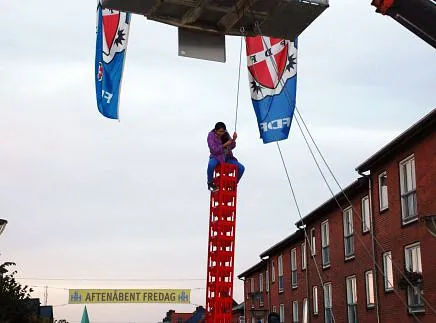 Hos FDF kunne man forsøge sig med at stable og kravle op på 20 ølkasser – her er det lige før det går galt ved nr. 18.