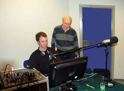 Radio Østsjælland 104-7 havde indrettet et hyggeligt studie på biblioteket, hvorfra der blev sendt live hele aftenen. Her er Michael og Ole i gang med teknikken.