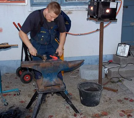 Uden for Museet er beslagssmeden ved at gøre en ny hestesko klar.