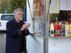 Erik Clausen var en af de første gæster ved Mona's Pølser. Her applauderer han Bente Kure og Leif Erntsen midt i den ristede pølse.