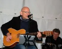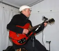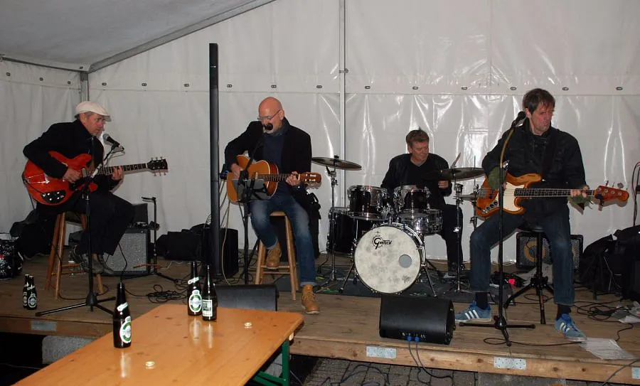 Trods ølmangel og kulde var der god stemning i Det store Telt på Torvet, da de fire fremragende musikere i Barflies DeLuxe spillede løs fra deres afvekslende repertoire.