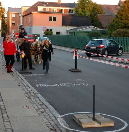 På Haslev Museum var der som altid en masse aktivitet. Inden det gik løs for alvor, afprøves hesteskokastbanen af museumsdirektøren, mens et par ansatte ser beundrende til. Læg mærke til den flyvende hestesko – og de to heste, som i baggrunden ser undrende på.