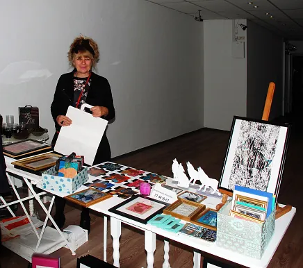 Birgit Brænder og Jonna Kroul havde en fin lille udstilling. af deres værker – og ydermere akkompagneret af en live trio med vikingemusik. Birgit Brænder, som ses på billedet har (som altid) leveret årets smukke kulturnatsplakat.