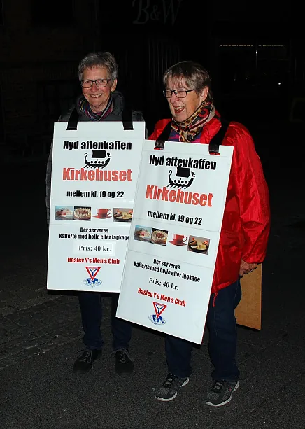 Et par sandwichdamer reklamerede for kaffe i kirkehuset.